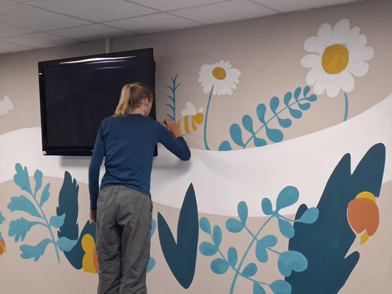 The winning design from our Wellbeing Hub competition has now been brought to life as a stunning mural in our dining social area. Izzy M’s beautiful drawing of flowers and insects was transformed into a striking wall painting over the summer by professional muralist Georgia Edwards.
